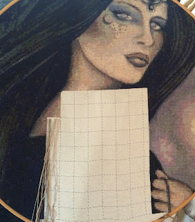 I do have a little update picture for you :) I decided that parking would be a good way to be economical with the threads for these last 3 pages, so here she is all gridded up and with a few hundred stitches in.